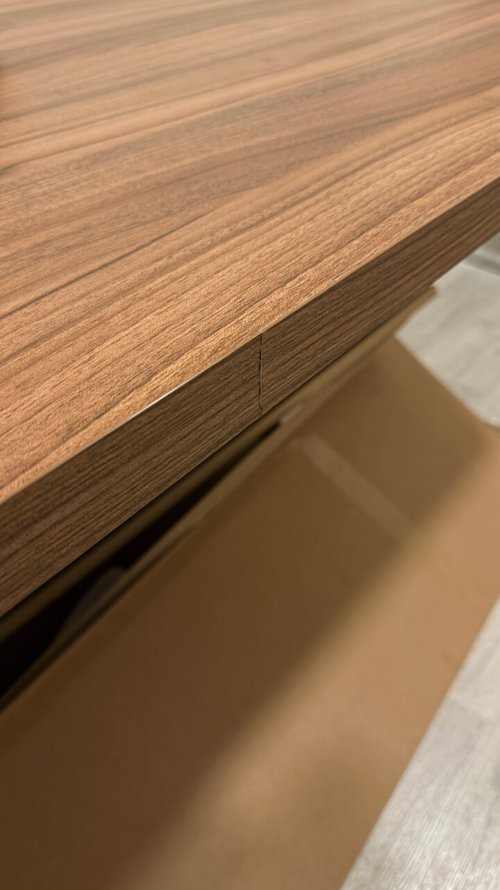 Bordpladen virker robust. Jeg valgte Oak Sherman-farven, da den harmonerer fint med den sorte stelfarve. Bordpladens design giver mig en lille følelse af ubehag. Der er intentionelle designridser, skrammer og lignende flere steder. Jeg er opmærksom på, at de er der med vilje. Jeg overvejer, om jeg foretrækker den side, der ikke ser sådan ud, fordi træmønsteret er lidt mere jævnt fordelt dér. Jeg har endnu ikke helt tilvænnet mig det, men jeg tror, at det med tiden ikke længere vil være noget, jeg behøver at bekymre mig om.