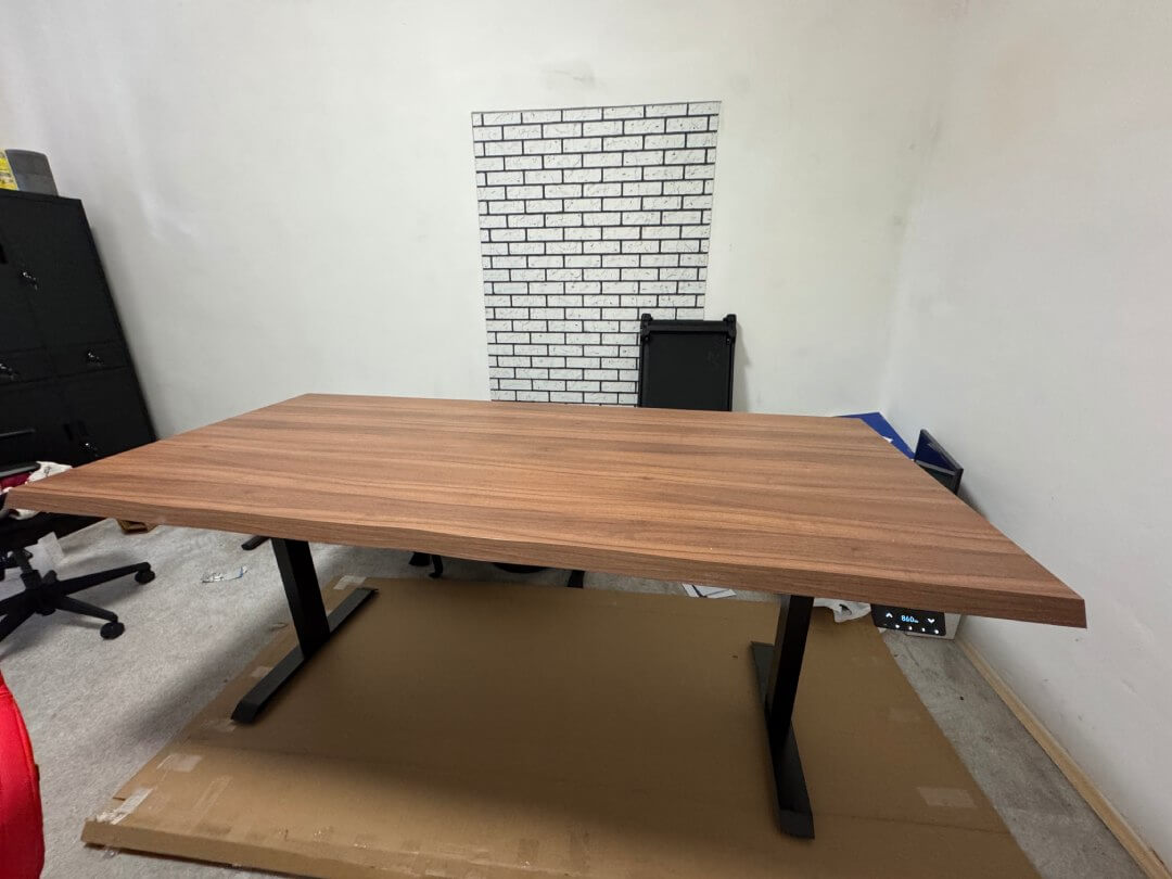 Bordpladen virker robust. Jeg valgte Oak Sherman-farven, da den harmonerer fint med den sorte stelfarve. Bordpladens design giver mig en lille følelse af ubehag. Der er intentionelle designridser, skrammer og lignende flere steder. Jeg er opmærksom på, at de er der med vilje. Jeg overvejer, om jeg foretrækker den side, der ikke ser sådan ud, fordi træmønsteret er lidt mere jævnt fordelt dér. Jeg har endnu ikke helt tilvænnet mig det, men jeg tror, at det med tiden ikke længere vil være noget, jeg behøver at bekymre mig om.