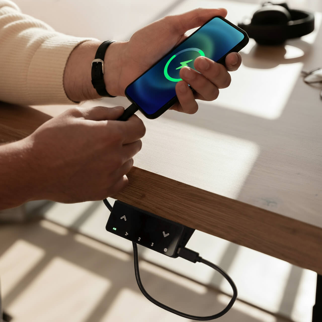 Integrerede porte i controlleren vil spare dig for at skulle lede efter en oplader. Du kan tilslutte din telefon, dit ur eller andre enheder direkte ved bordet og have alt lige ved hånden.