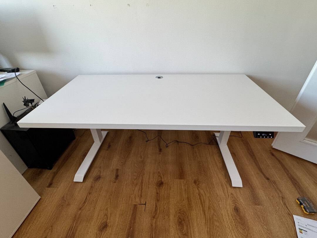 Jeg kunne skære gevindet i to af hullerne med en skrue, men måtte bruge et gevindskæringsværktøj i det ene. Det er ikke en almindelig installation. Til prisen havde jeg forventet et bedre håndværk. Jeg kunne sagtens have købt noget billigere hos en konkurrent. Til en stor plade er belastningskapaciteten på 100 kg for lav. En 200 x 80 x 4 cm massiv egetræsplade vejer over 50 kg. Hvis jeg tilføjer f.eks. et skærmstativ, skærme, en bærbar computer, højttalere og et par småting, får jeg ikke lov til at sætte f.eks. en printer på skrivebordet.